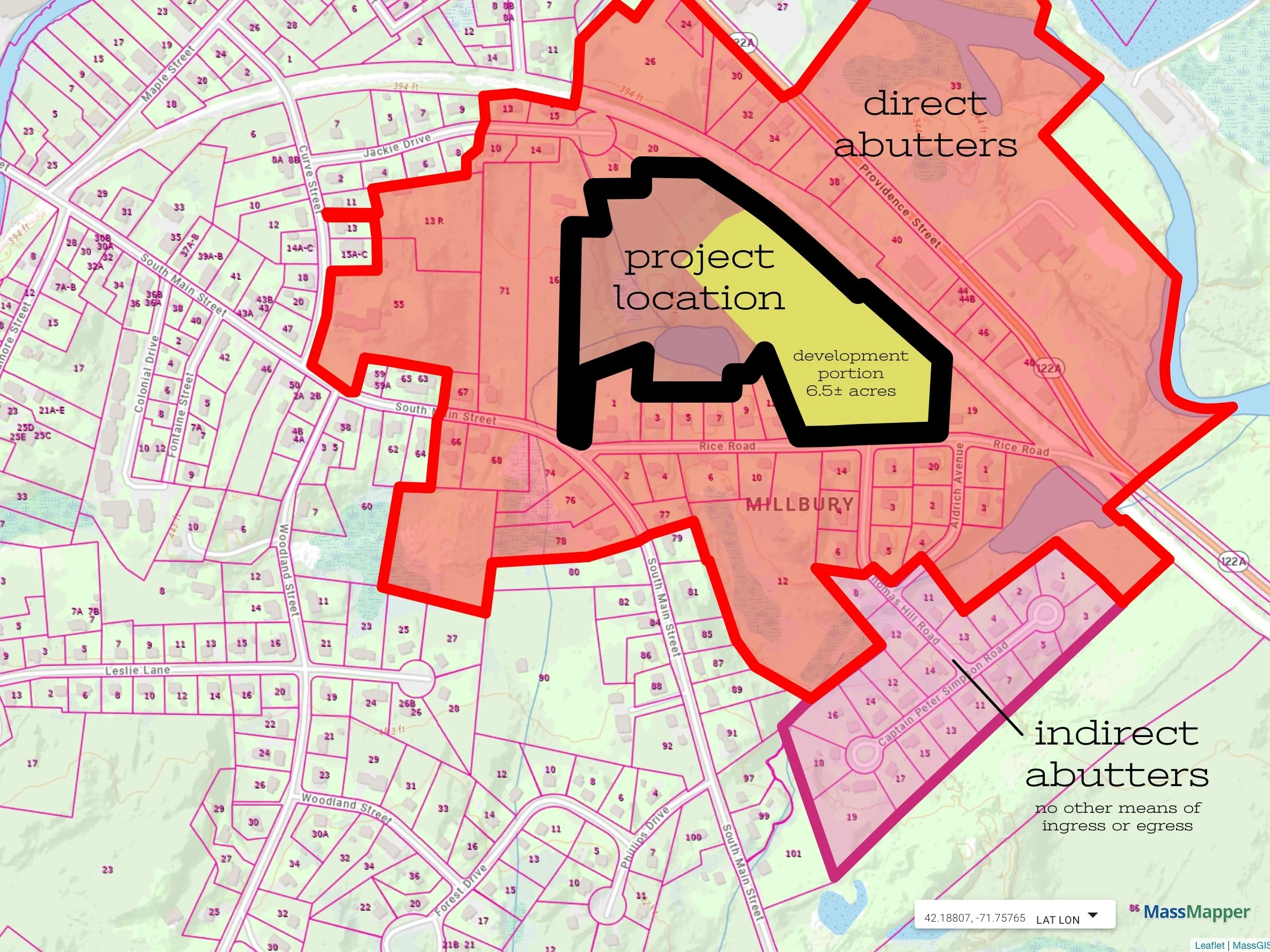In comparing the proposed Chapter 40B Local Initiative Program (LIP) Rice Pond Village project with direct abutters, those properties within 300-feet of the proposed project site (as determined by the Millbury Assessor), the proposed Chapter 40B LIP Rice Pond Village project will have a density of 29.5 based upon the development portion of the site (6.5± acres), whereas the existing immediate and surrounding neighborhood properties have a median density of 2.5. If you calculate the density over the whole site (16.0904± acres), then the density is 11.8, however, a large portion is part of the NationalGrid electricity transmission line easement (from South Main Street to the Providence & Worcester Railroad), Rice Pond, wetlands and various wildlife habitats, and therefore is unusable or inaccessible.